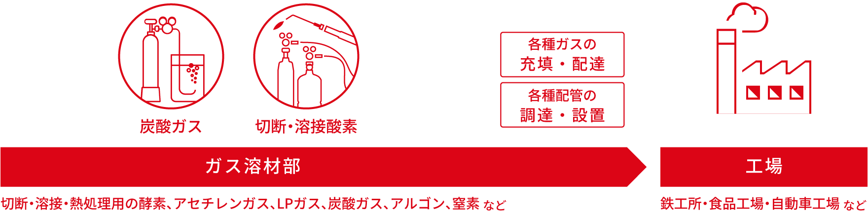 ガス溶材部は、主として工場内で使用する工業用の高圧ガスや生産ラインにおける各種機器の販売を行っています。メインとなる工業用ガスは、切断・溶接・熱処理といった金属加工に必要となる酸素やアセチレンガス、LPガス、炭酸ガス、アルゴン、窒素等の高品質な高圧ガスです。また、生産ラインで必要な各種機器では、切断や溶接、研削、切削等の金属加工の製造工程において必要となる溶接・溶断機器や溶接材料、産業ロボット、工作機械などを販売しています。こうした商品を提供する取引先は、主として鉄鋼や自動車、機械、建設、食品、化学分野などの多岐にわたる業界です。
