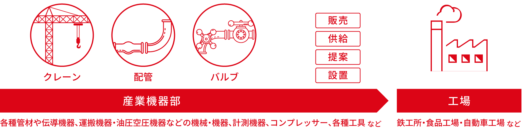 あらゆる工場を対象に一流メーカーとのパートナーシップを強みに管材や工場設備、クレーン、作業工具などを販売している産業機器部。ビルや工場の設備工事に不可欠な管材では、バルブ・パイプ・継手・ポンプ・計器類など多種多様な形態・素材の種類を豊富に取りそろえています。設備機器類では、コンベアをはじめとする運搬機器、モーター・ベアリング等の伝動機器、空圧機器、油圧機器などの一流メーカー品をラインナップ。製造業に欠かせない工具類として、顧客のニーズに合わせ電動・切削・作業工具等を豊富に取りそろえ、スピーディーに供給します。