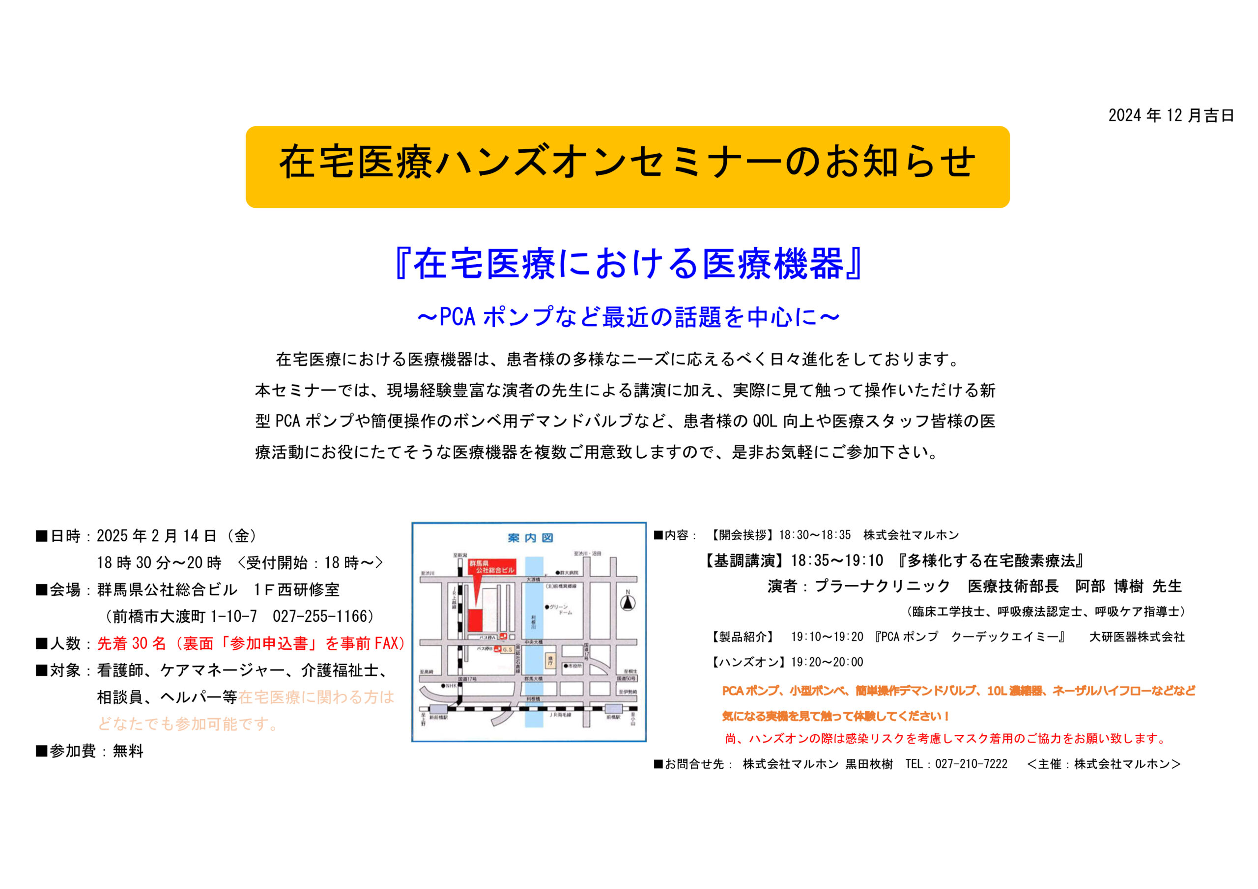 ニュース NEWS トップニュース【終了】ハンズオンセミナー前橋 MEDICAL 2025.02.14 【終了】ハンズオンセミナー前橋 当日はご参加ありがとうございました。概要及び、当日の様子のお写真を載せさせていただきます。今後も定期的に開催させていただきますので、お気軽にご参加ください。◆日時:2025年2月14日(金) 18時30分~20時 <受付開始:18時~>◆会場:群馬県公社総合ビル 1F西研修室◆対象:看護師、ケアマネジャー、介護福祉士、相談員、ヘルバー等 在宅医療に関わる方はどなたでも参加可能です。 画像を拡大 前の記事次の記事 一覧に戻る