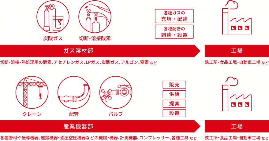 ガス溶材部と産業機器部は、マルホンの中核事業の一つとして成長してきました。ガス溶材部の主な事業は、高圧ガス関連の販売事業と、溶接材料・溶断機器・機械工具の販売事業の2つ。ガス販売事業では、鉄鋼・自動車・機械・建設などに必要な金属加工をメインに、食品・化学分野において切断・溶接・熱処理用の酵素、アセチレンガス、LPガス、炭酸ガス、アルゴン、窒素といった高品質な工業用ガスを販売しています。
